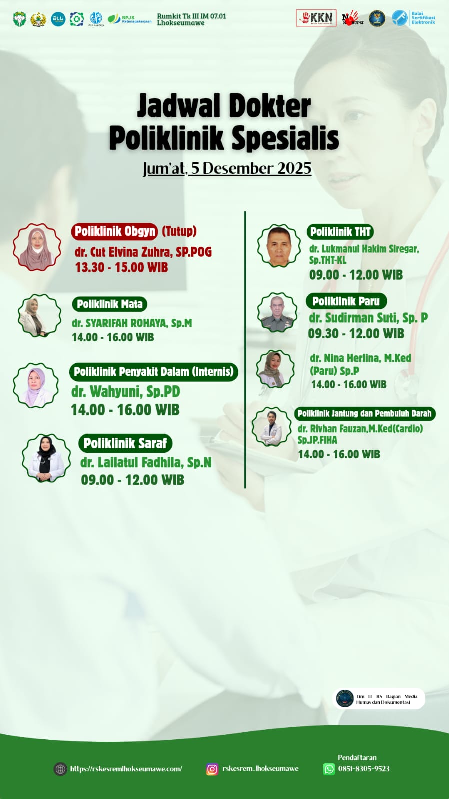 JADWAL DOKTER PELAYANAN RUMAH SAKIT TK III IM 07.01 LHOKSEUMAWE HARI JUM’AT 05 DESEMBER 2025!