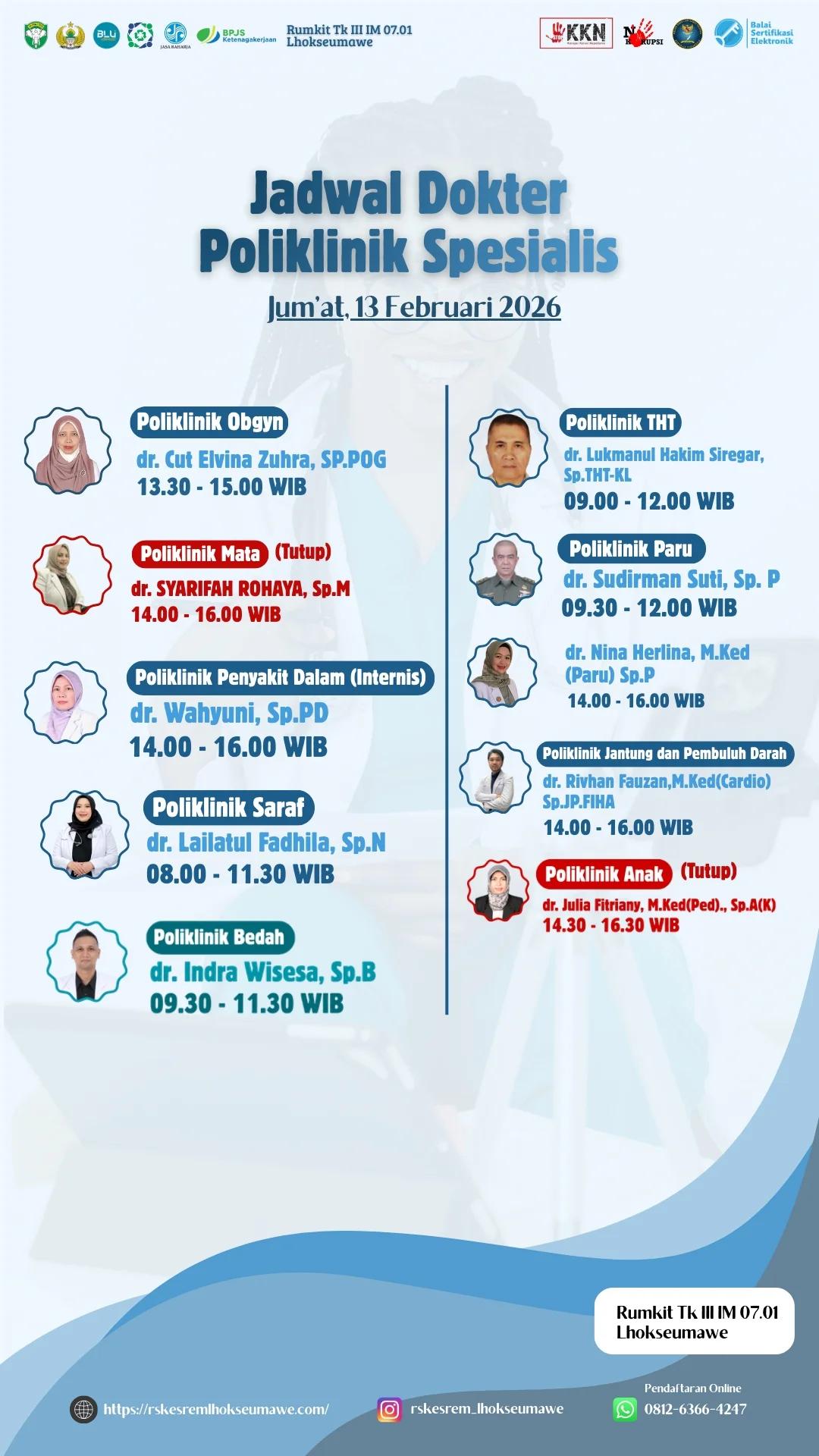 JADWAL DOKTER PELAYANAN RUMAH SAKIT TK III IM 07.01 LHOKSEUMAWE HARI JUM’AT, 13 FEBRUARI 2026