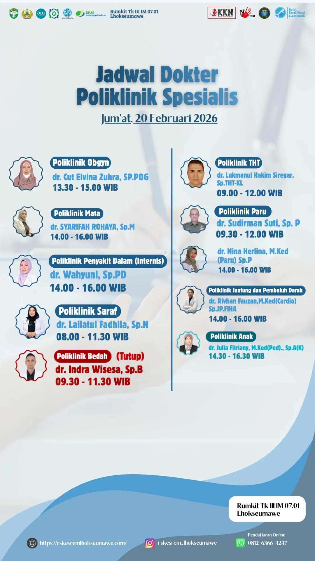 JADWAL DOKTER PELAYANAN RUMAH SAKIT TK III IM 07.01 LHOKSEUMAWE HARI JUM’AT, 20 FEBRUARI 2026