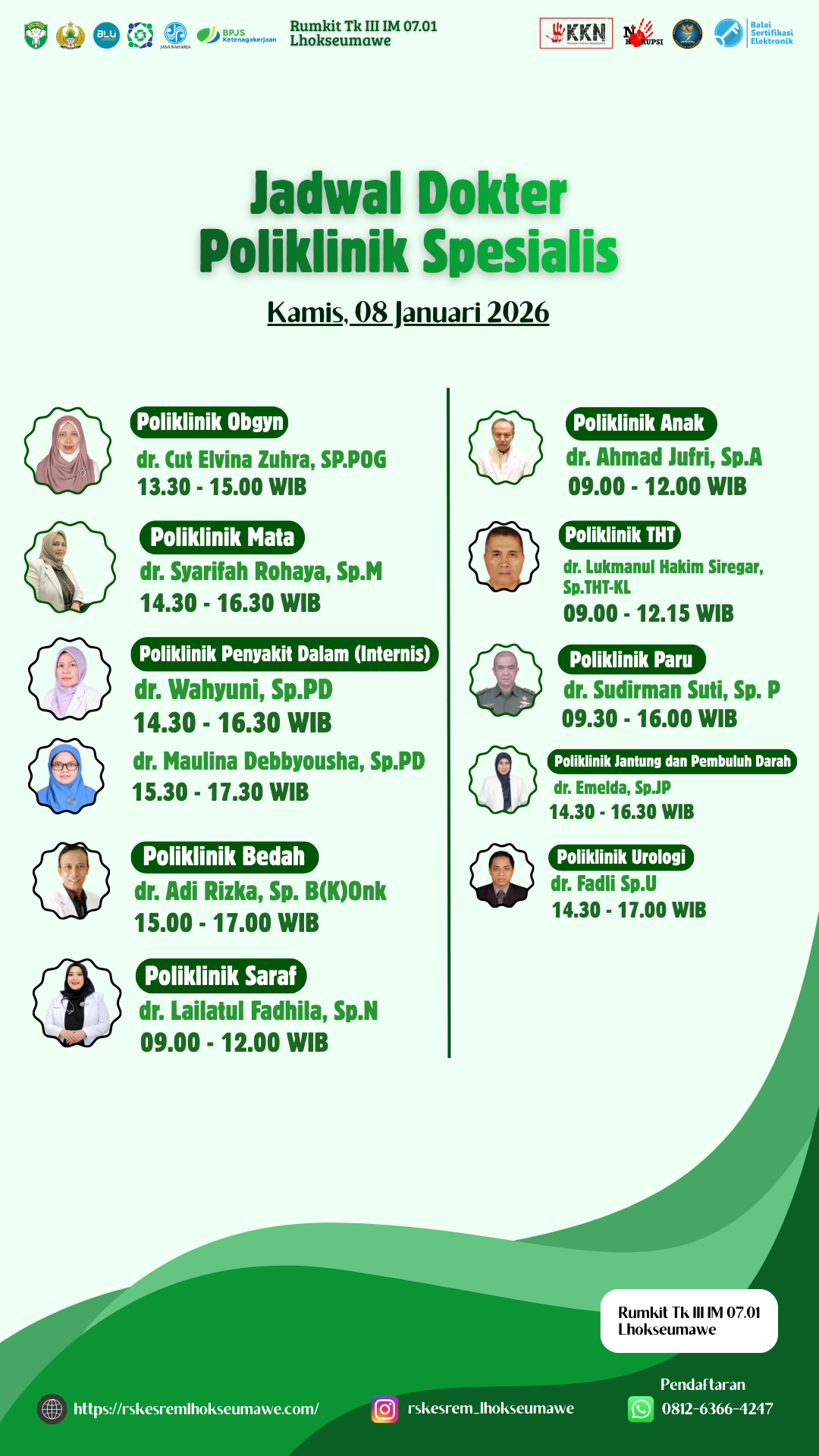 JADWAL DOKTER PELAYANAN RUMAH SAKIT TK III IM 07.01 LHOKSEUMAWE HARI KAMIS, 08 JANUARI 2026!