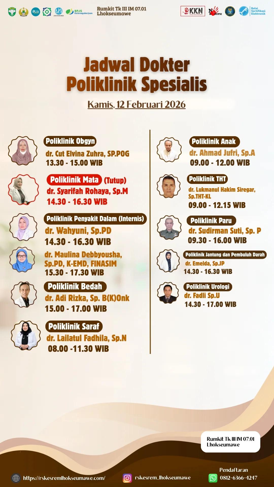 JADWAL DOKTER PELAYANAN RUMAH SAKIT TK III IM 07.01 LHOKSEUMAWE HARI KAMIS, 12 FEBRUARI 2026