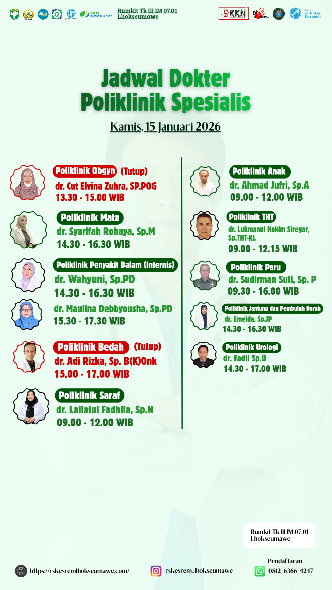 JADWAL DOKTER PELAYANAN RUMAH SAKIT TK III IM 07.01 LHOKSEUMAWE HARI KAMIS, 15 JANUARI 2026