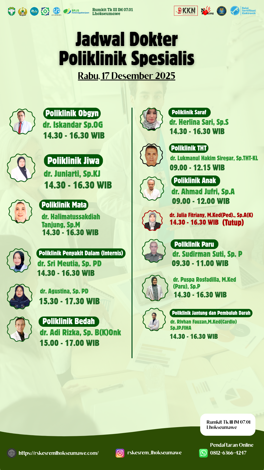 JADWAL DOKTER PELAYANAN RUMAH SAKIT TK III IM 07.01 LHOKSEUMAWE HARI RABU, 17 DESEMBER 2025!
