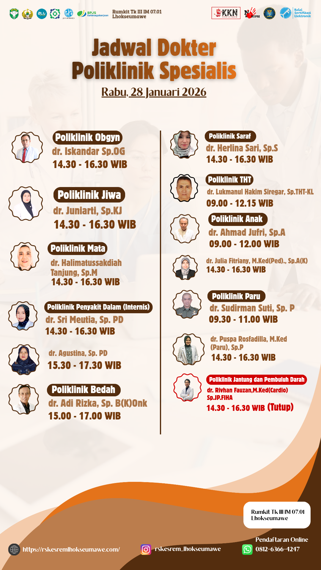 JADWAL DOKTER PELAYANAN RUMAH SAKIT TK III IM 07.01 LHOKSEUMAWE HARI RABU, 28 JANUARI 2026
