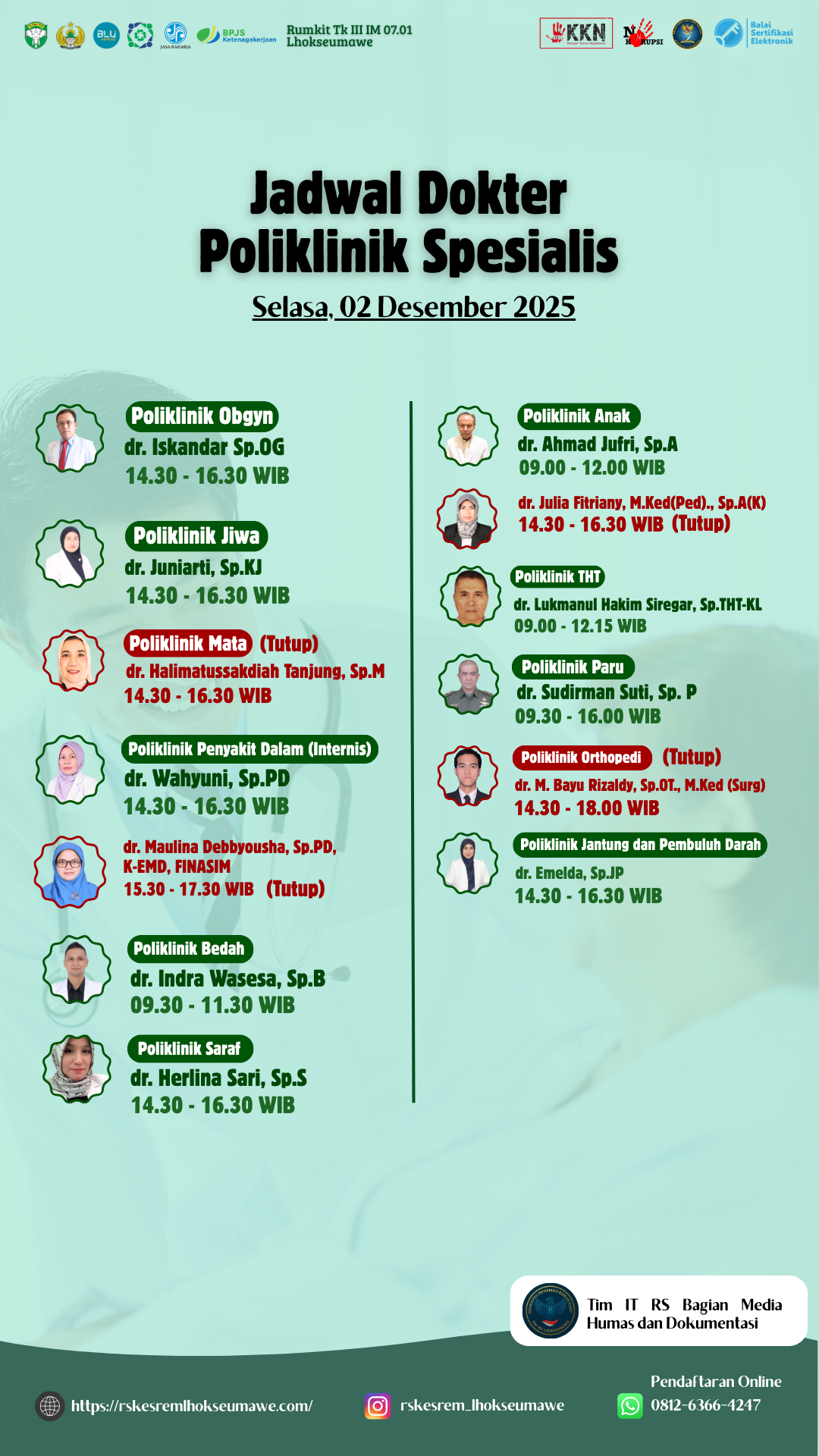 JADWAL DOKTER PELAYANAN RUMAH SAKIT TK III IM 07.01 LHOKSEUMAWE HARI SELASA 02 DESEMBER 2025!