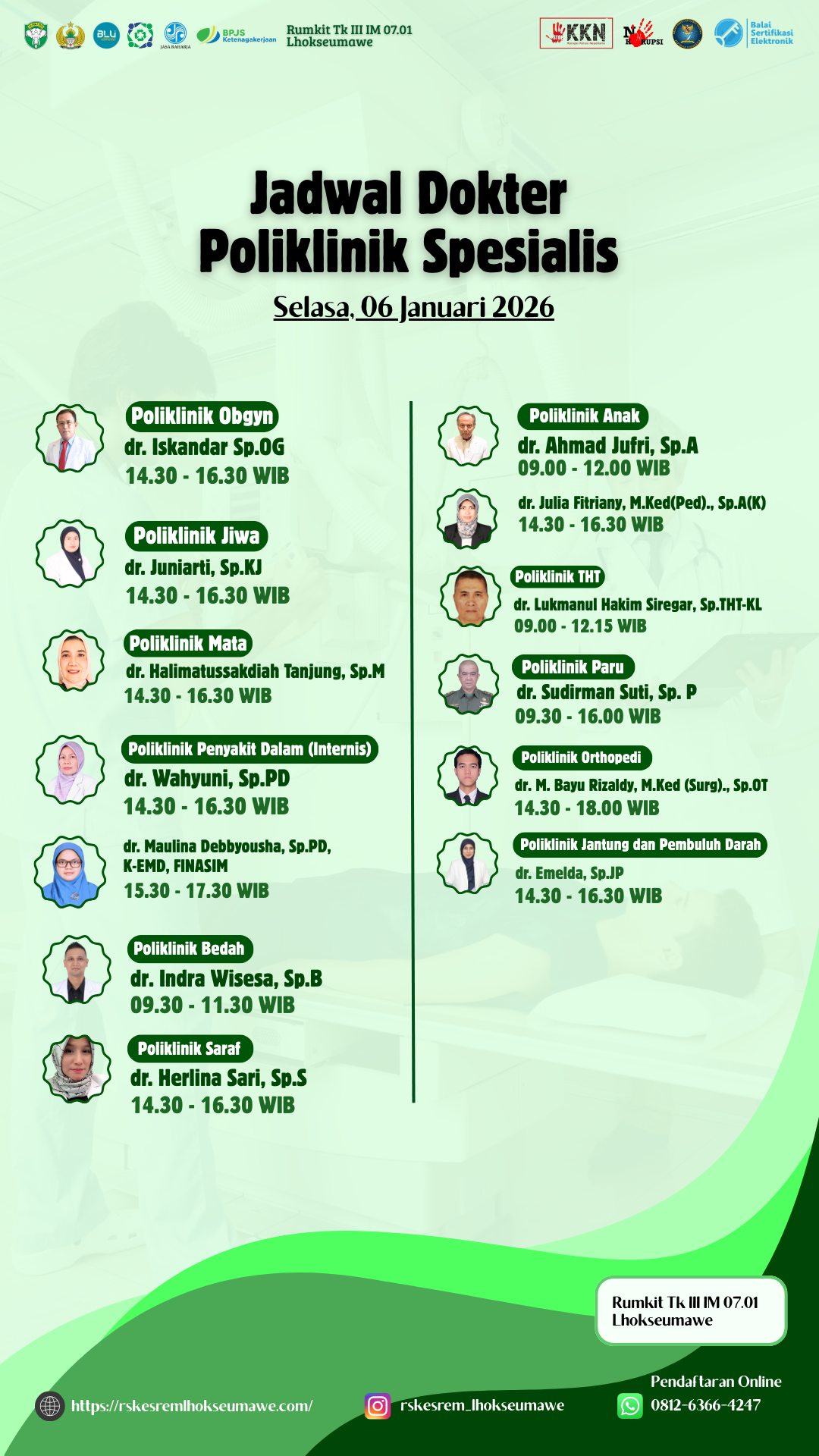 JADWAL DOKTER PELAYANAN RUMAH SAKIT TK III IM 07.01 LHOKSEUMAWE HARI SELASA, 06 JANUARI 2026!