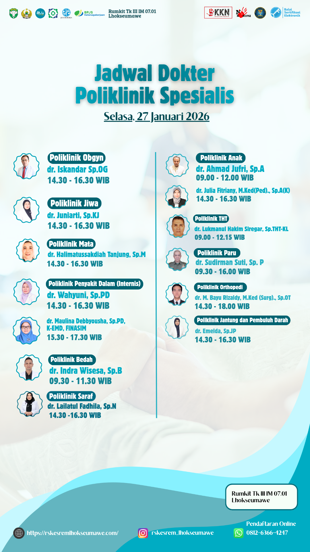 JADWAL DOKTER PELAYANAN RUMAH SAKIT TK III IM 07.01 LHOKSEUMAWE HARI SELASA, 27 JANUARI 2026
