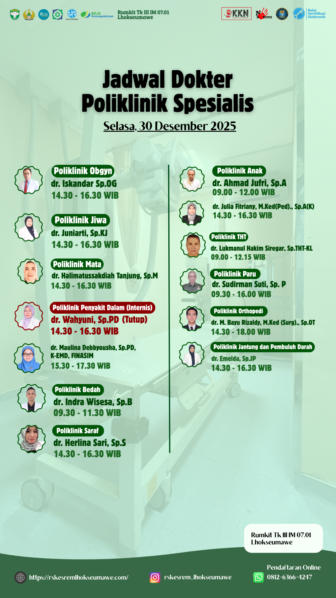 JADWAL DOKTER PELAYANAN RUMAH SAKIT TK III IM 07.01 LHOKSEUMAWE HARI SELASA, 30 DESEMBER 2025!
