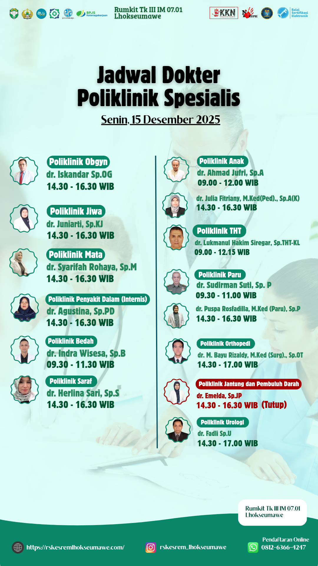 JADWAL DOKTER PELAYANAN RUMAH SAKIT TK III IM 07.01 LHOKSEUMAWE HARI SENIN, 15 DESEMBER 2025!